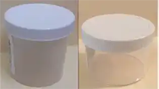 These are clear plastic or natural plastic with a white screw top lid. They will hold 8 oz. or 12 oz. of enamel. They are used with labels. You will need to wash and remove the labels. You can easily remove the labels by pouring boiling water into the container, let stand for about 1 minute, then slowly peel the label from one corner.